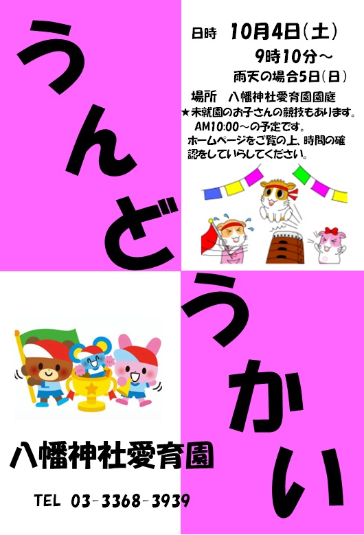 10月4日(土) 午前9:10~午後2:00頃まで(予定)、園庭にて運動会を行います。ご家族の皆様や、ご近隣の方にもご覧いただけます。皆様どうぞご来園のうえ、子どもたちの元気な姿をご覧ください。